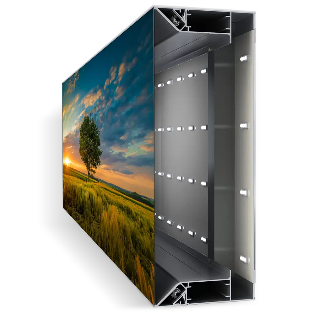 Klapprahmen für Poster und Plakate: Robuste Verarbeitung, schnelles Wechseln von Inhalten. Auch mit LED Beleuchtung.